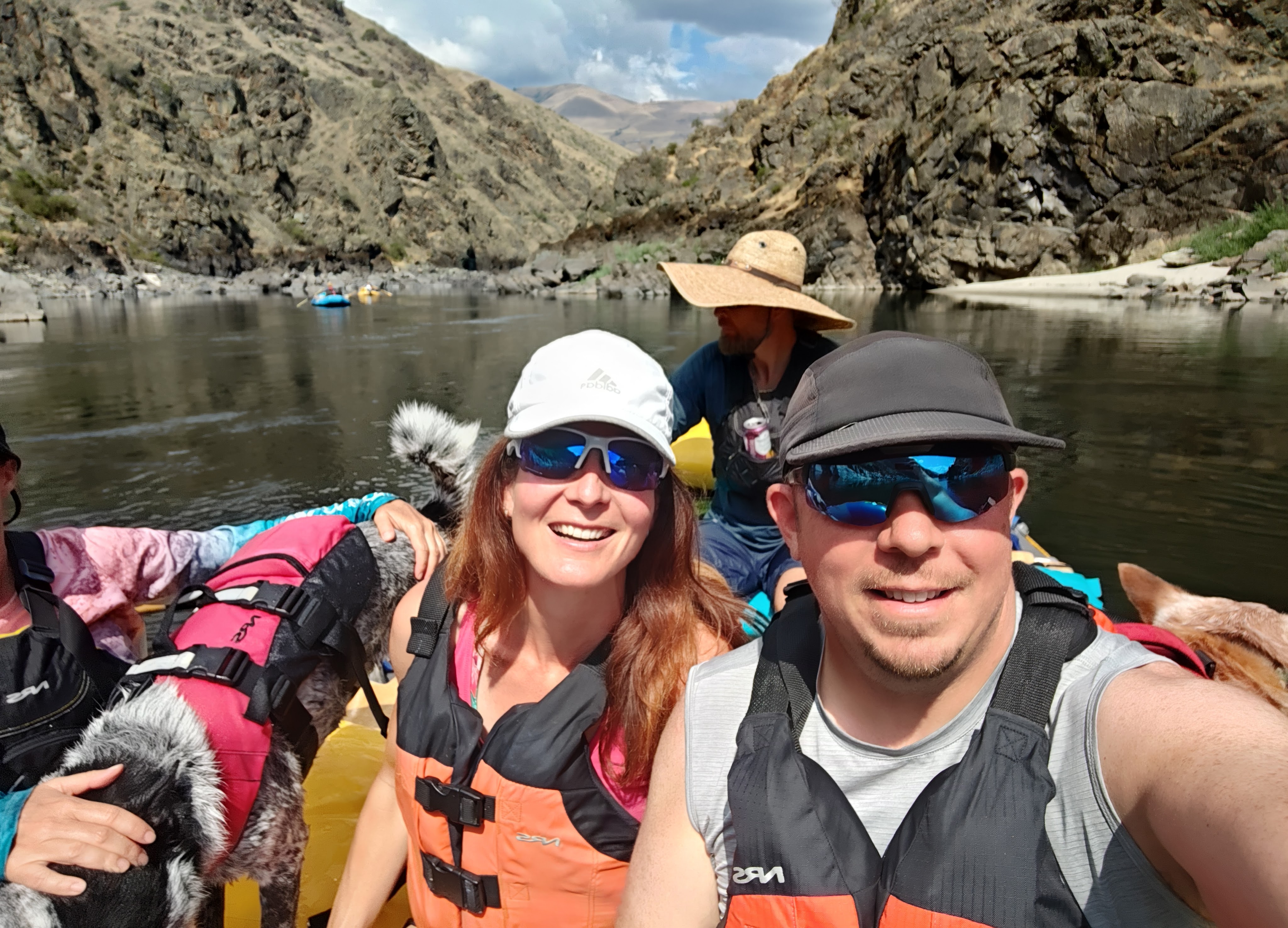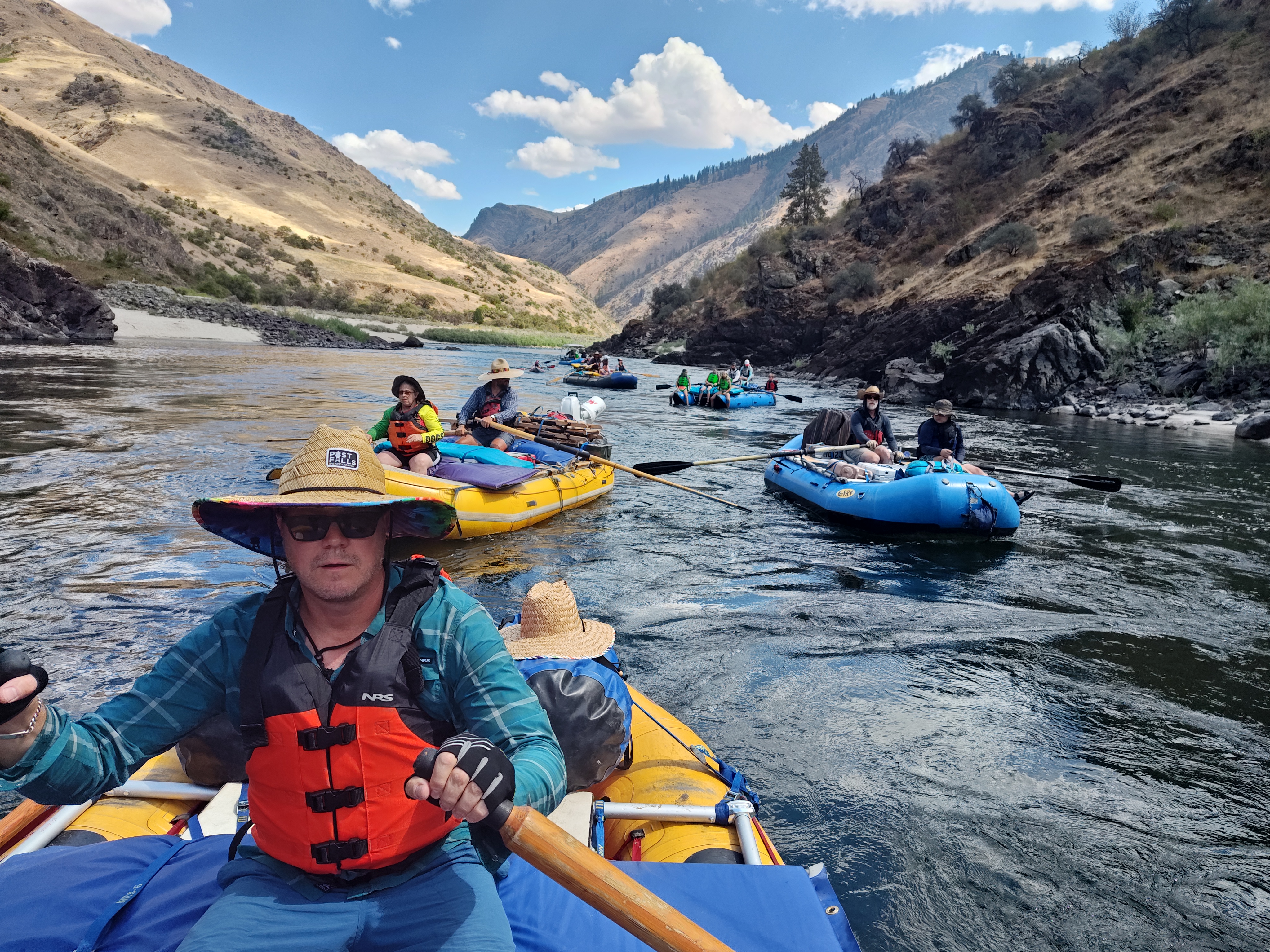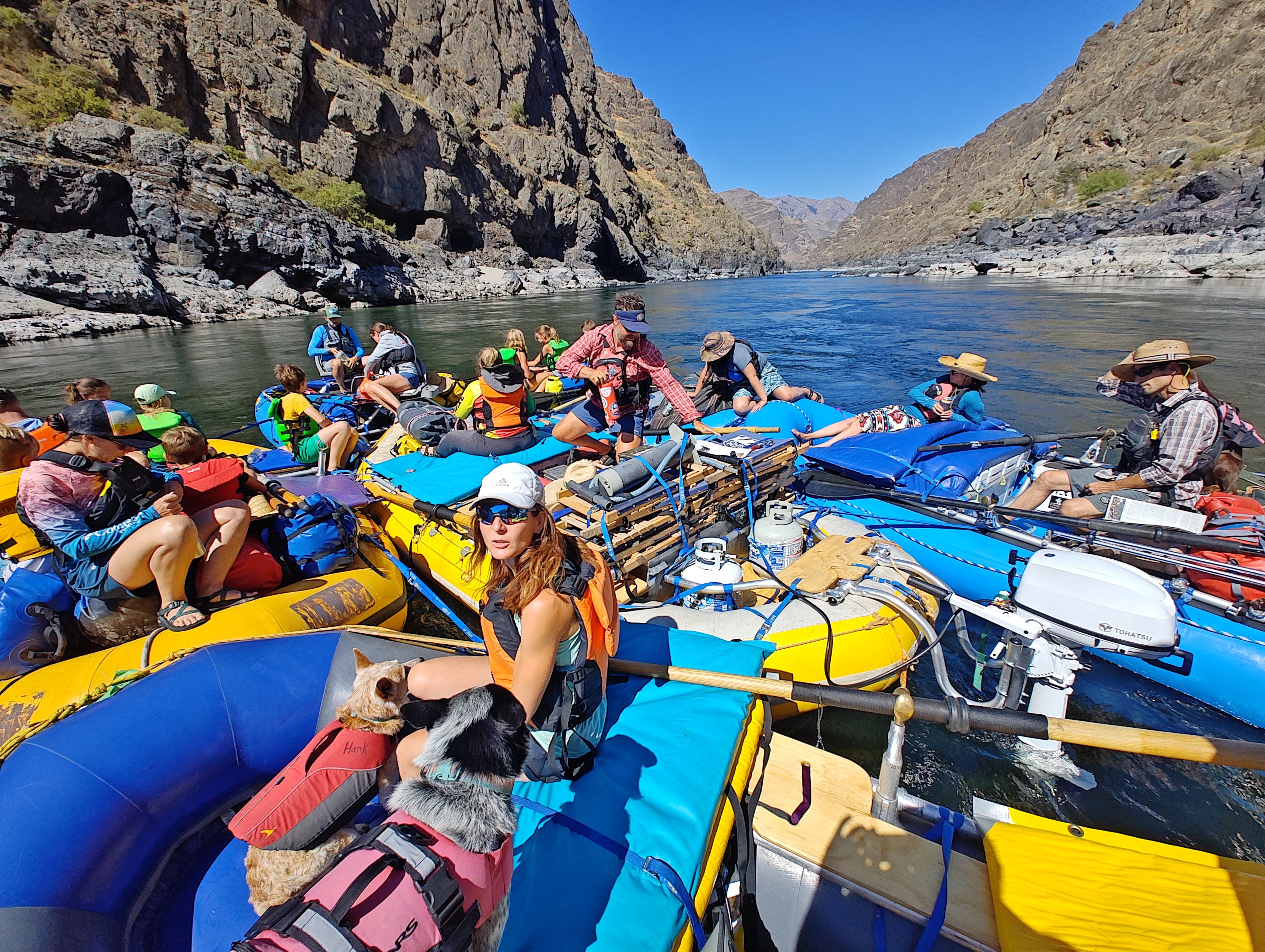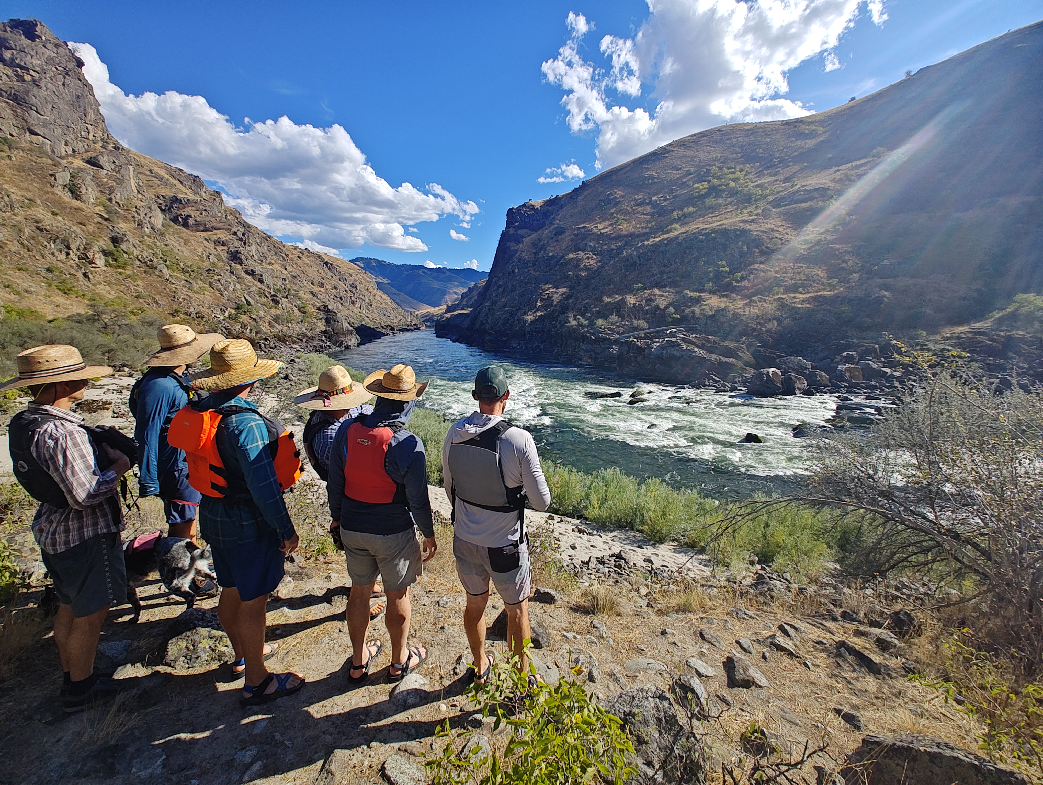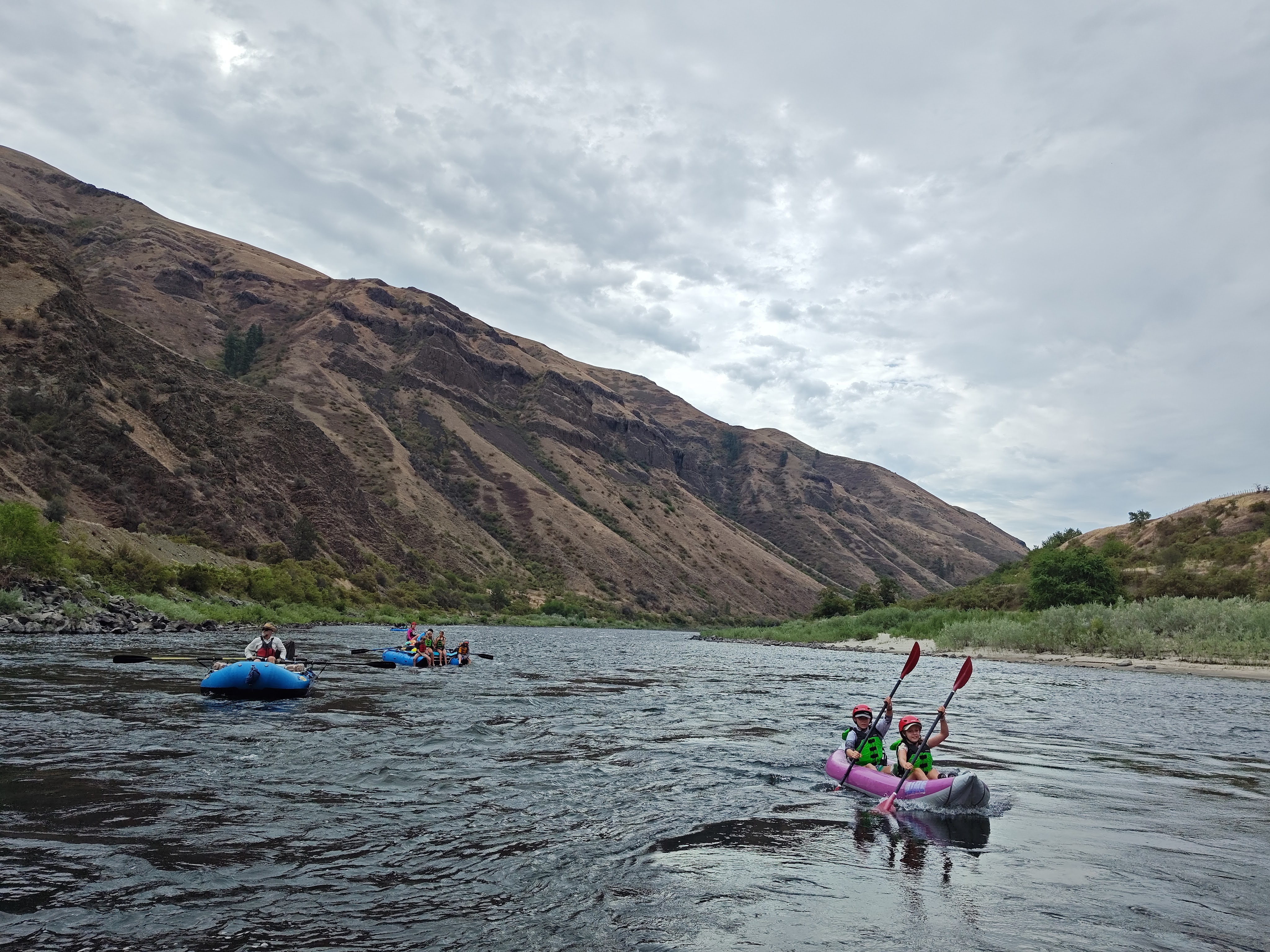 Čekal nás pětidenní 115 km dlouhý sjezd Salmon a Snake River (82 km na Salmon a poté 33 na Snake). Celkem nás na 6 raftech jelo 13 dospělých, 9 dětí a 4 psi.