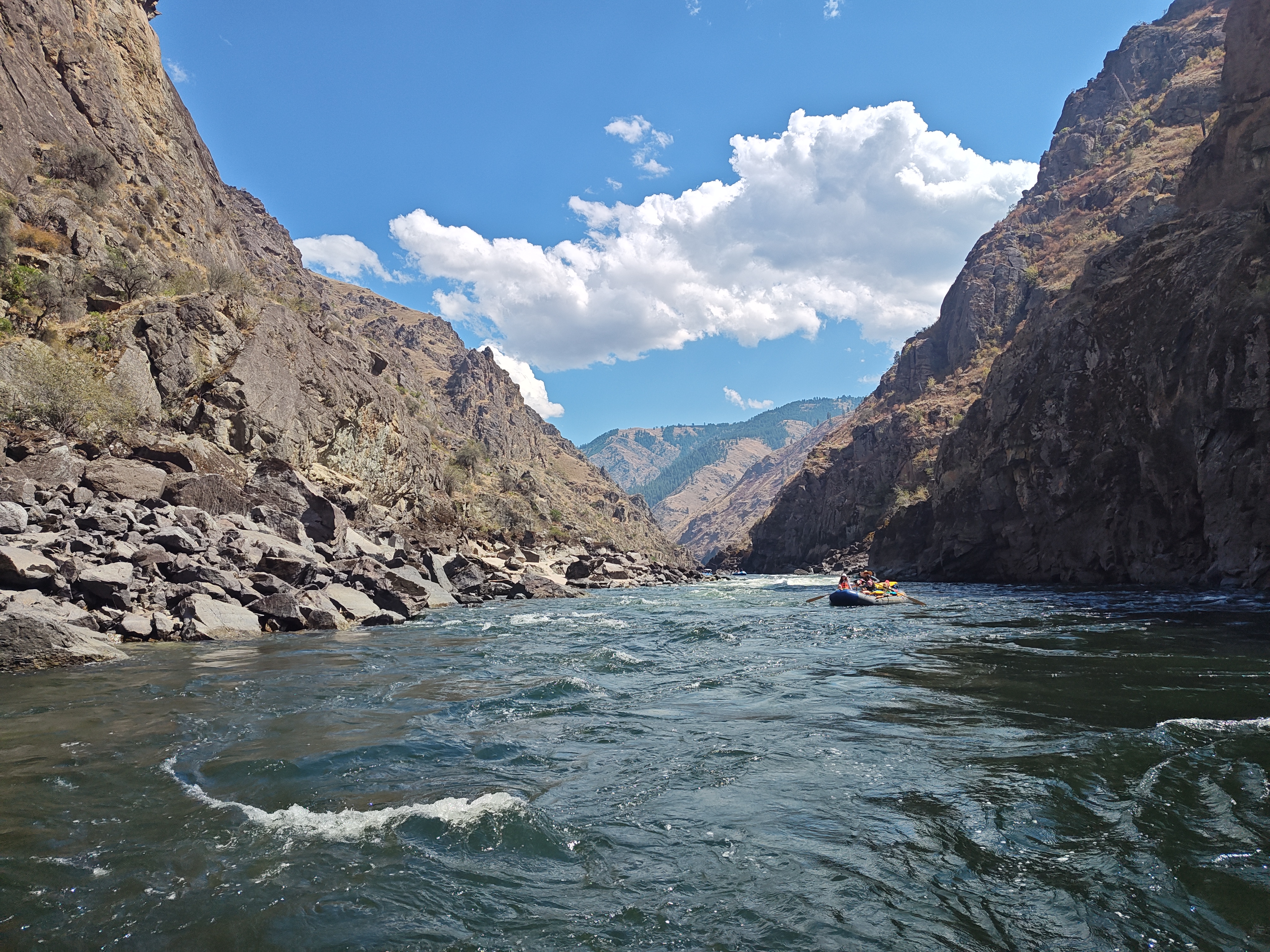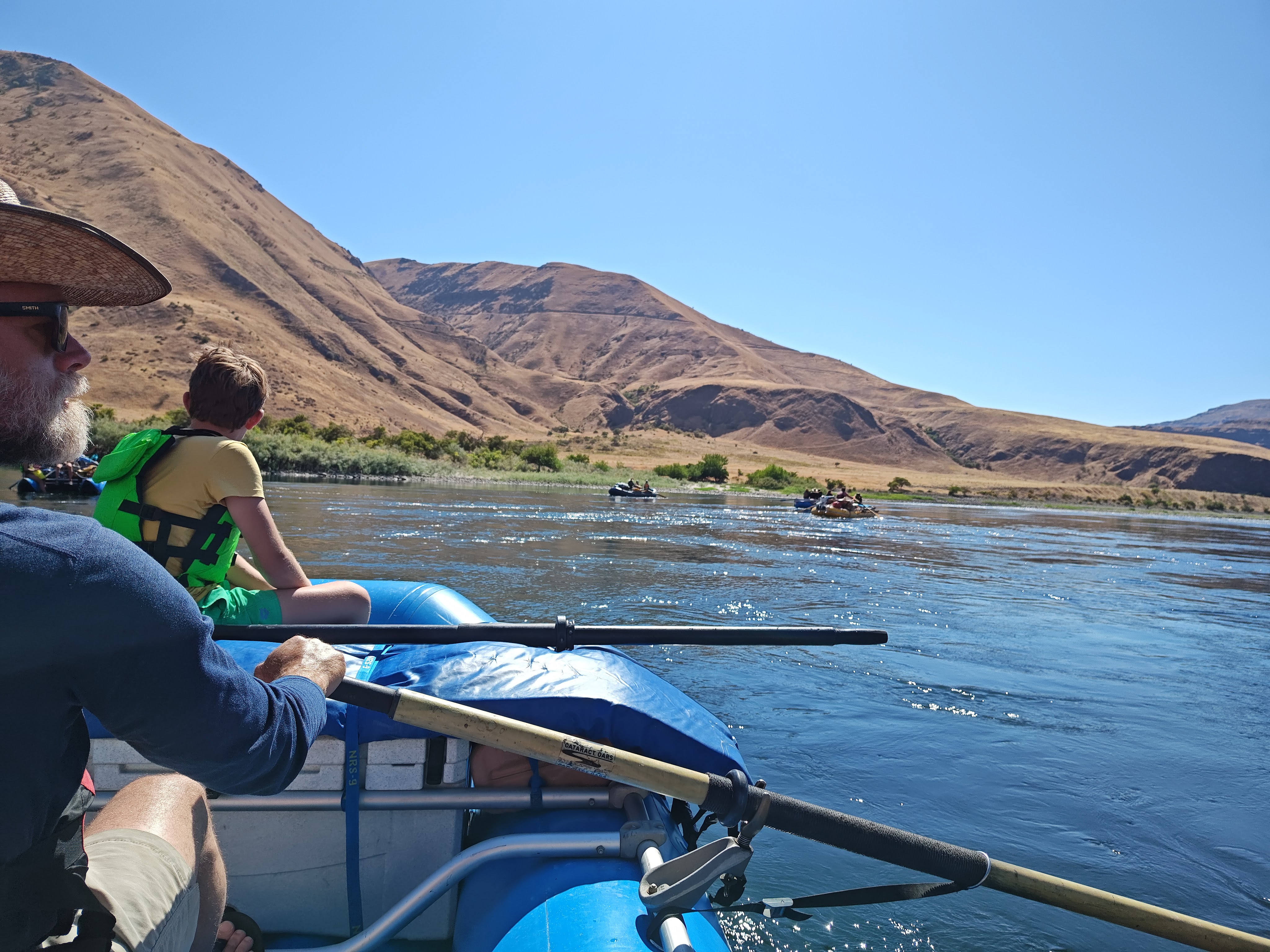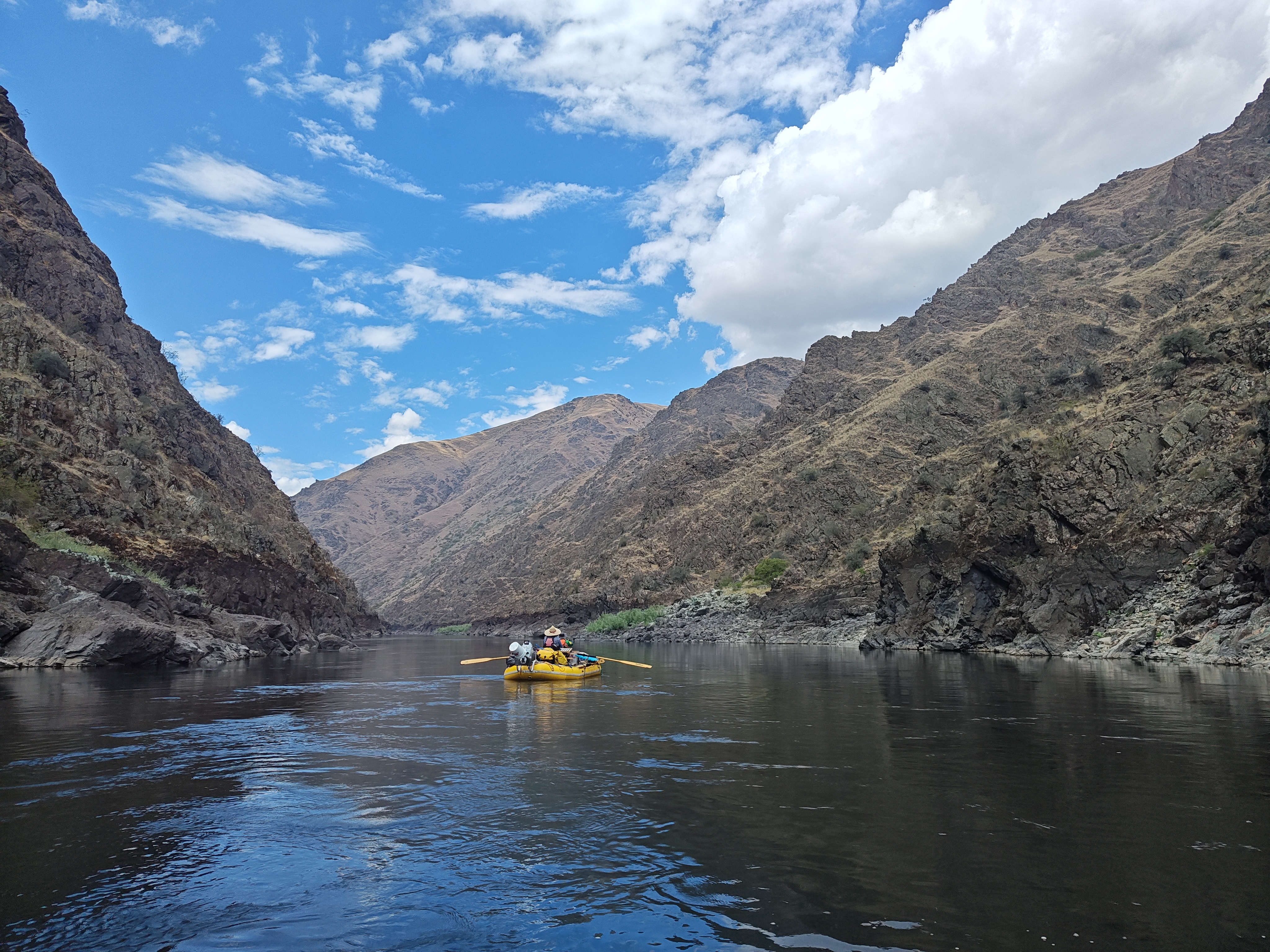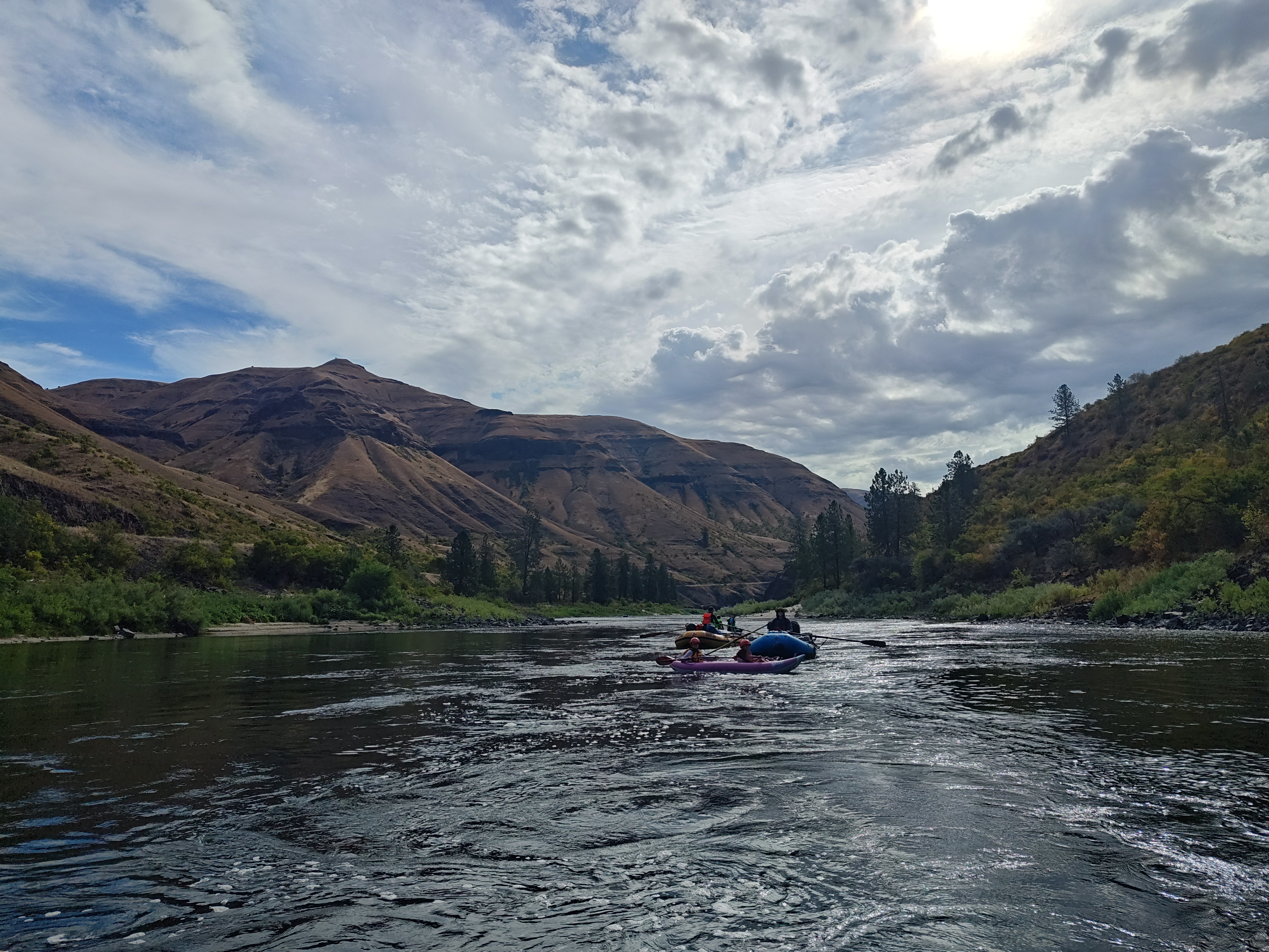 Po soutoku řek Salmon a Snake se významně mění podmínky – kaňon se rozšiřuje a pravidelně zde fouká velmi silný protivítr. V takových podmínkách bychom se nedostali zpět včas a hlavně by nás to totálně utavilo, takže posledních cca 30 km jsme odjeli v soulodí na motor.