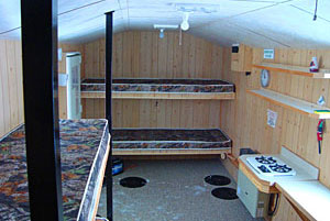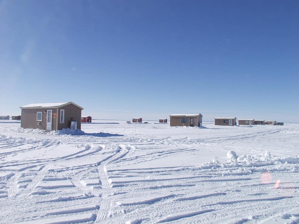 Icefishing je tu dost populární a jak jsem se od Tonyho dozvěděla, tak sice ne tady, ale běžně v Kanadě, nebo třeba ve státě Minnesota je možné si pronajmout rybářský domek, který si přitáhnete přímo na led a v kterém můžete vesele chytat třeba rovnou z postele. Vypadat to může takhle: