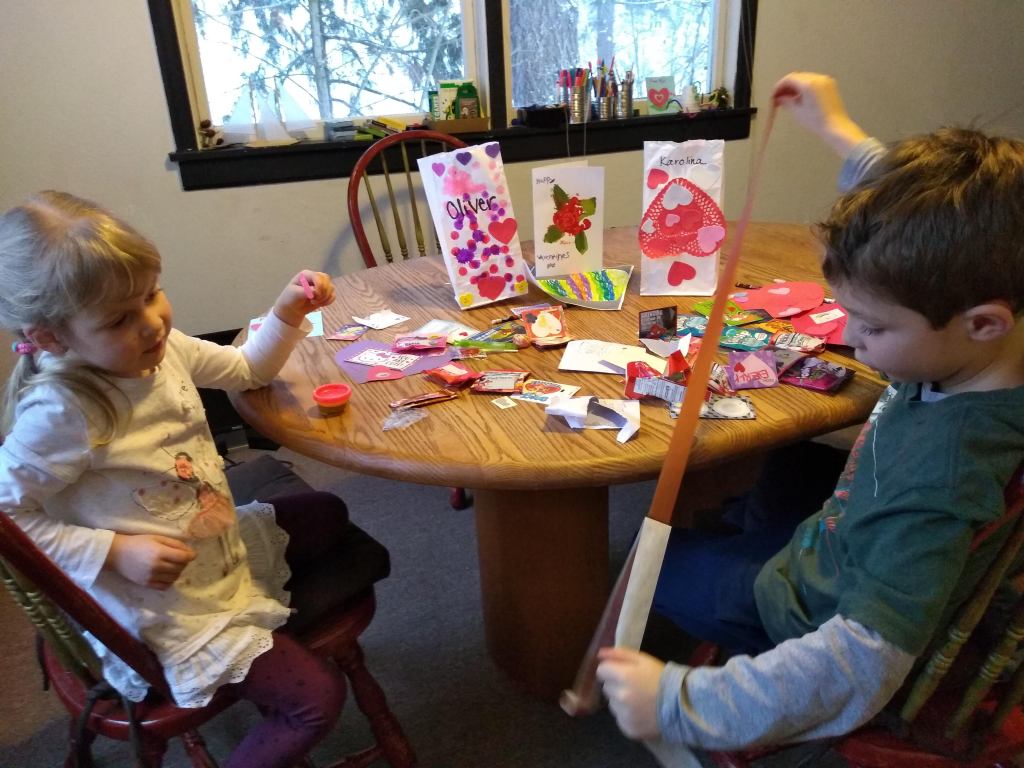 Ovšem ve školce jsme se oslavám nevyhnuli. Děti dostaly za úkol přinést pro každého spolužáka ve třídě přání. Zadání znělo: “Na přání napište pouze od koho je, nikoliv pro koho. Nic jiného než přání přinést nemusíte.” Rozhodli jsme se tedy, že když už nemají napsat nikomu nic adresně, tak aspoň přání vyrobíme (přičemž jsem tak trochu očekávala, že s vlastnoručními výtvory budeme mezi ostatními za exoty). Do školky jsme tedy donesli adekvátní počet vyrobených přání, které děti vlastnoručně podepsaly a já jsem s napětím očekávala, s čím přijdou ze školky domů. Bohužel, míra komercionalizace tohoto svátku opět předčila naše očekávání. Kromě asi dvou vyrobených přání totiž děcka donesla hromadu sladkostí, či malých dárečků, na jejichž valentýnských obalech už bylo od výrobce předepsáno od koho/pro koho a stačilo pouze fixem doplnit jméno.