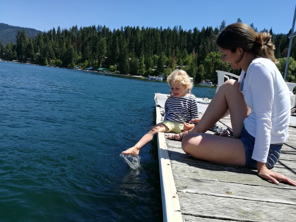 A teď k těm hicům – Coeur d’Alene je na takováhle horka připravený. Je tu neuvěřitelně zeleně, vzrostlé, pro mě až gigantické stromy všude kolem. Náš domek je ze všech stran stromy odstíněný, takže i v 35° tu je příjemně chladno.
