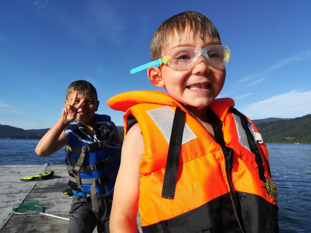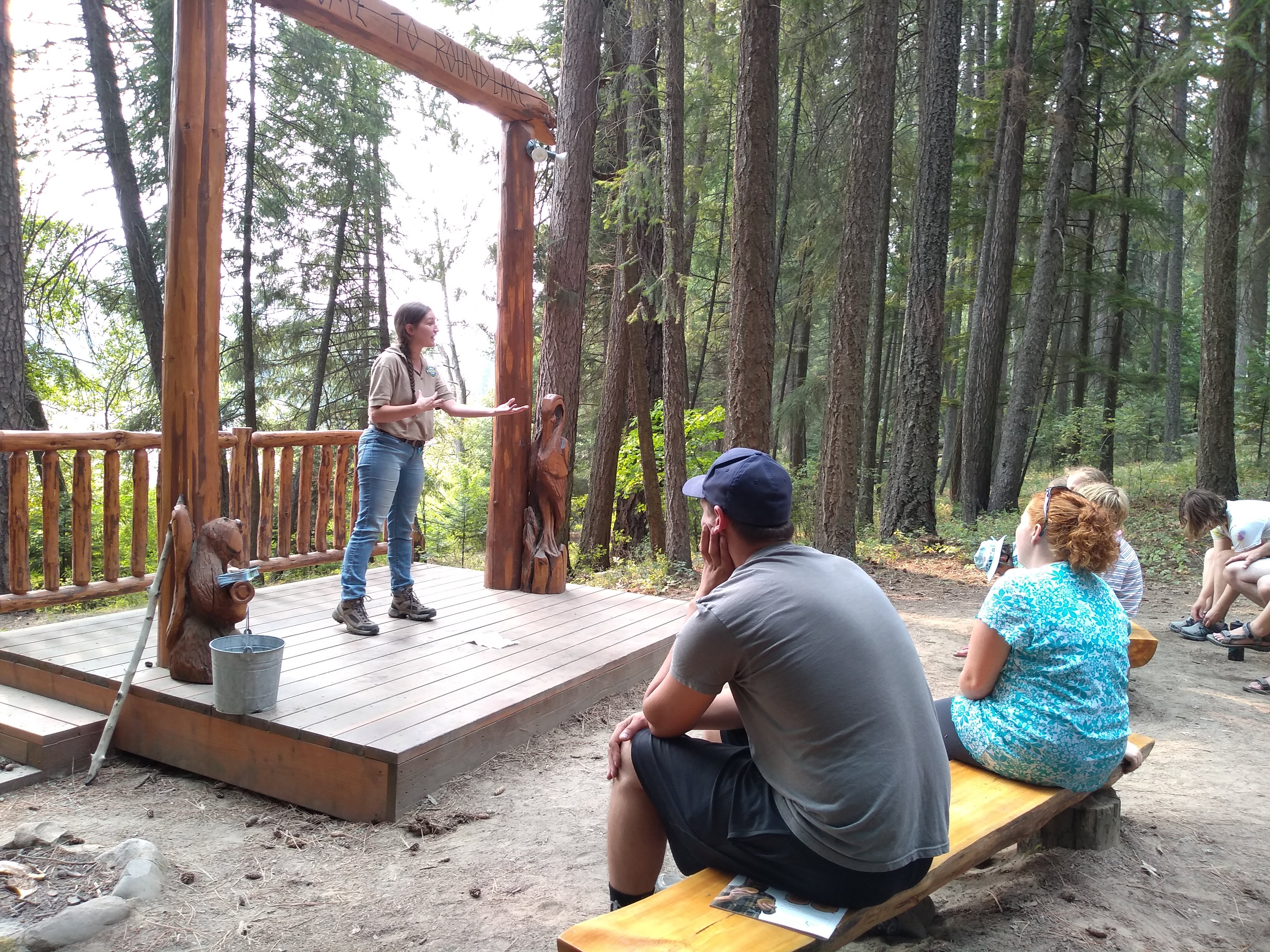Dnes jsme vyrazili na výlet do Státního parku Round Lake asi 45 min. severně od Coeur d’Alene, kde místní Rangers (zaměstnanci parků, kteří udržují lesy, jezera, kempy, turistické cesty, starají se o celkovou bezpečnost lidí, fauny i flory apod.) pořádali krátkou přednášku pro děti o požární bezpečnosti.