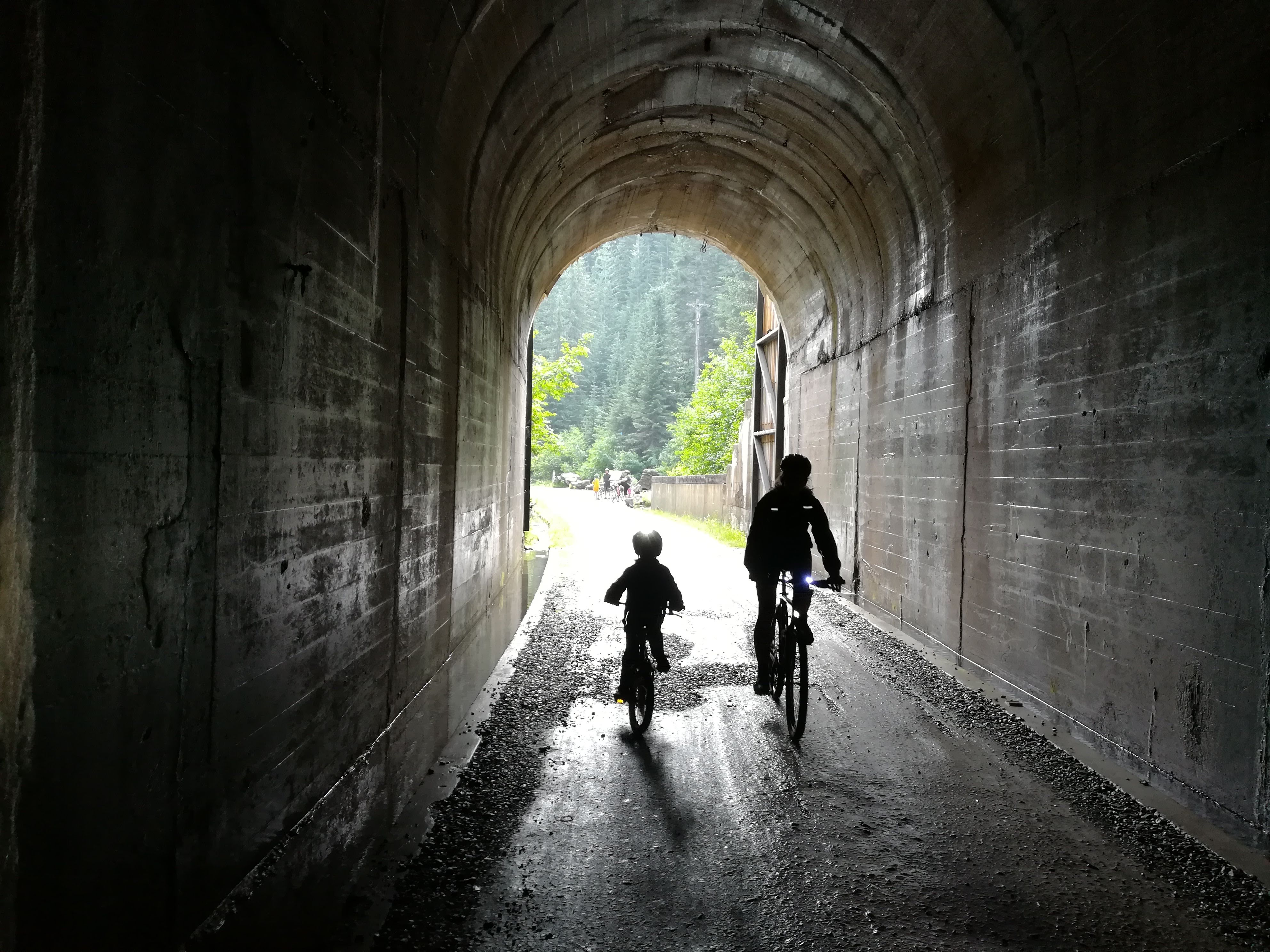 Nyní je cesta, kudy trať vedla, zpřístupněna pouze cyklistům. Cesta začíná nejdelším, 2,7 km dlouhým, tunelem. Tunely jsou zcela temné, povinným vybavením je tedy helma a čelovka. Asi nejlepší na celé trase je fakt, že vede celou dobu z kopce a na konci na vás čeká vyřazený školní autobus a vyveze vás zpět na začátek ;-). Olí šlapal jako ďábel a Kája se poprvé v životě vezla ve vozíku za kolem. Té už tolik do skoku nebylo – nebo vlastně bylo – až moc. Kromě toho, že jsme z ní málem vytřásli duši, ještě 3/4 cesty nic neviděla, protože měla úplně zablácený výhled. Byl to jediný den, kdy jsme tu zažili pořádný slejvák. Vlastně ne tady, ale tam. Bláto jsme měli všude a stálo to za to.
